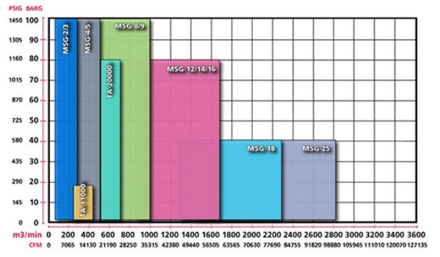 流量范围:2720 ~195400m3/hr;出口压力最高至80barg;轴功率最大至18650KW。